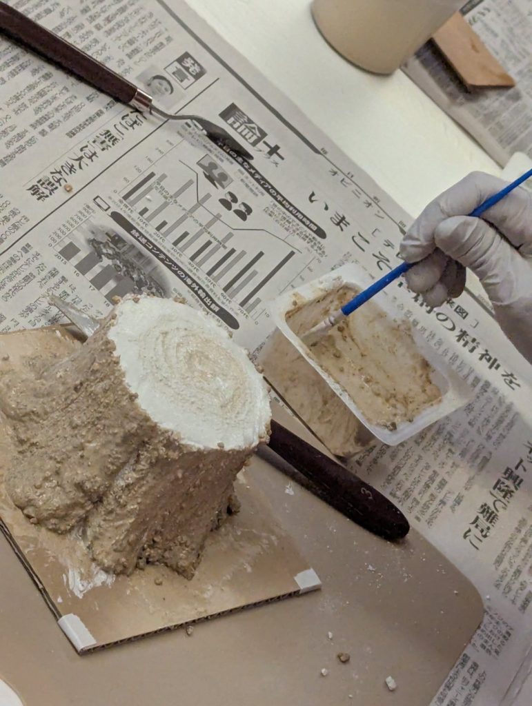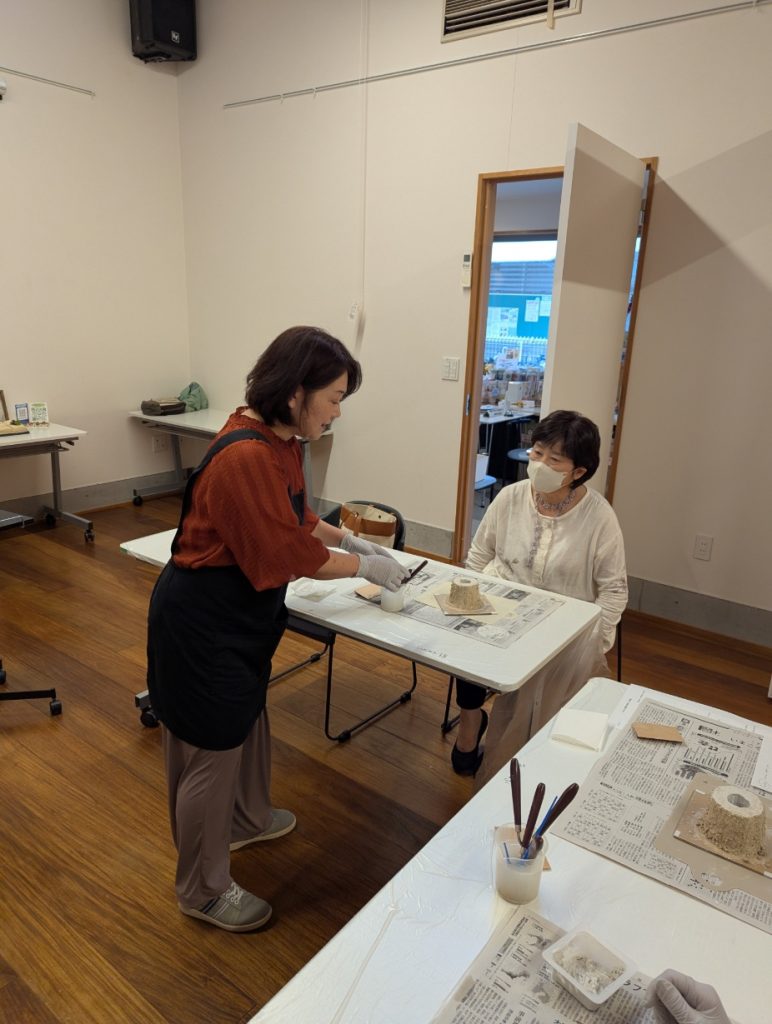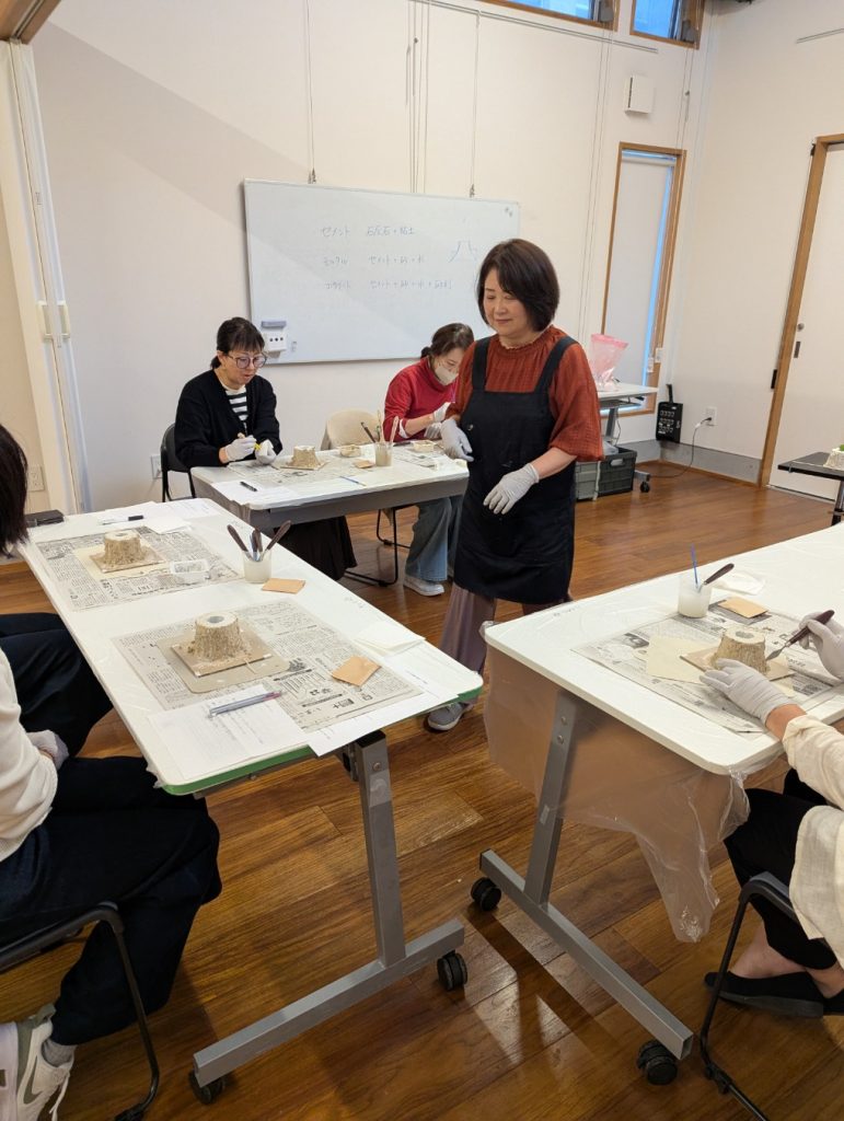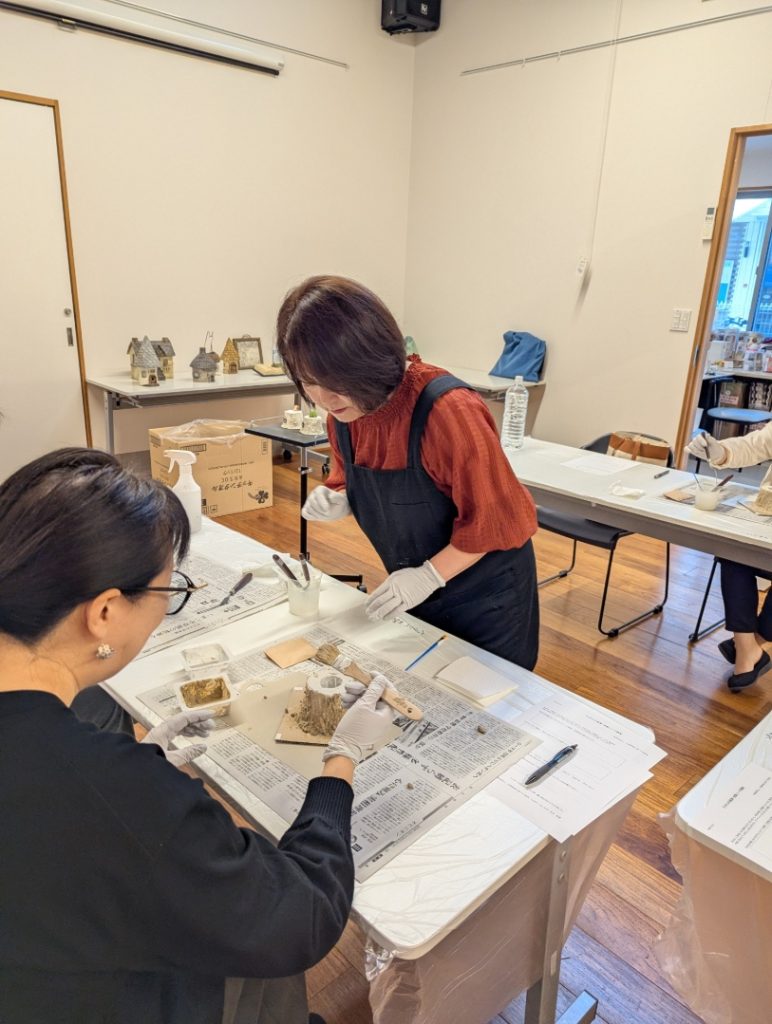 今回お申込いただいた方々、以前からモルタルデコに興味があったとおっしゃる方が多く、やり始めから皆さん、興味津々です・・・動く手も早く、先生のご指導のもとどんどん進めていきます。