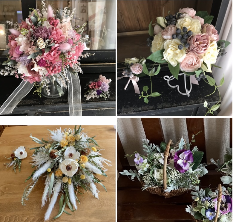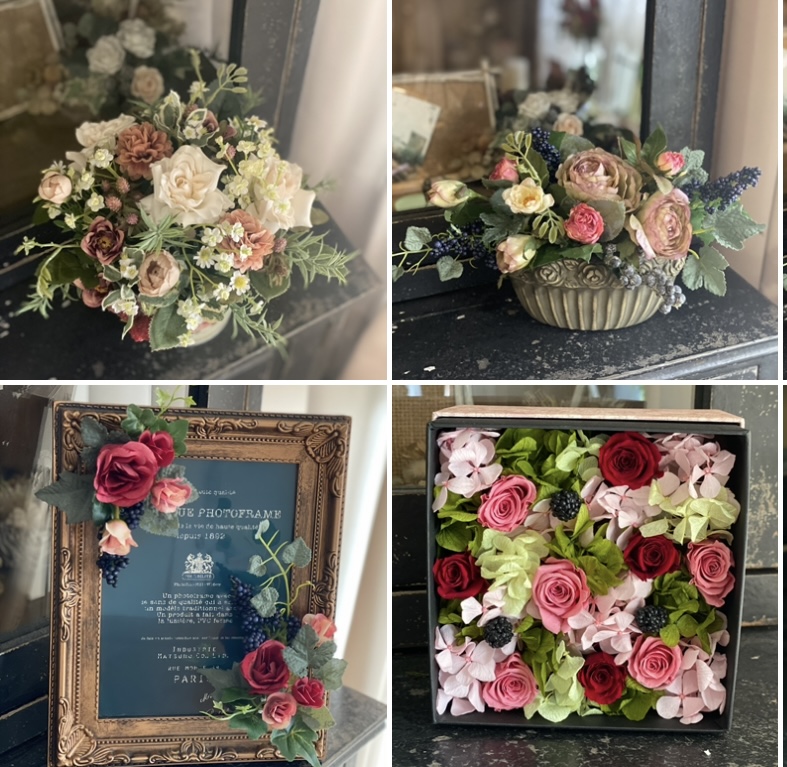 ドライ・プリザーブド・アーティシャルフラワーを使ってフラワーアレンジメントを制作しています